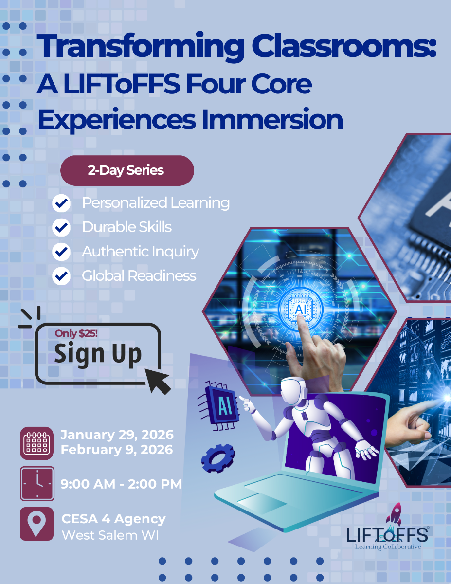 This 2-day event (Jan 29 & Feb 9, 2026) invites all LIFToFFS educators and leaders to explore how the LIFToFFS Four Core Experiences come together to create high-engagement, high-impact LIFToFFS classrooms. Day 1 centers on how Personalized Learning and Durable Skills shape empowered, capable learners. Day 2 focuses on Authentic Inquiry and Global Readiness to build classrooms where curiosity, relevance, and real-world thinking thrive. Participants will leave with a clearer vision, ready-to-use strategies, and a cohesive pathway for transforming teaching and learning in ways that ignite every learner.